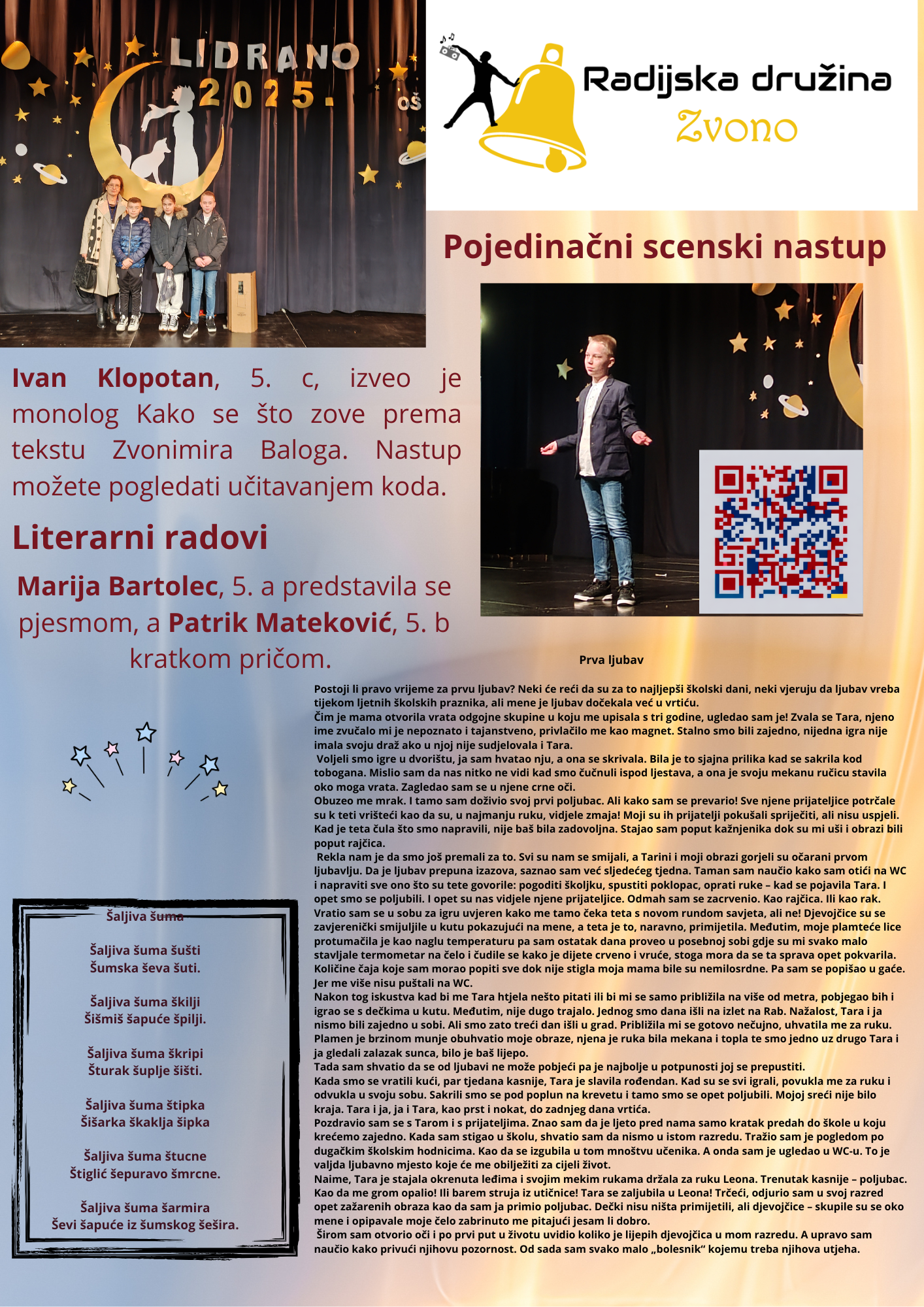 Na ovogodišnjoj smotri LiDraNo polaznice Radijske družine Zvono (Marija Gazdek, Matea Trnski, Klara Falat i Ena Benković) predstavile su se radijskom emisijom Riba ribi grize rep (županijska razina), radioigrom Postolar i vrag (državna razina) u kojoj je postolara glumio Tin Šavor iz 8. razreda; novinarskim radovima 0 ili 1 BIT-ni intervju (autorica Ena Benković), Prepoznajemo ih po patikama (autorica Matea Trnski) i Ribolov (ni)je potraga za zlatnom ribicom (autorica Klara Falat).